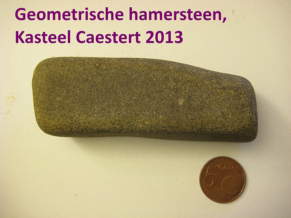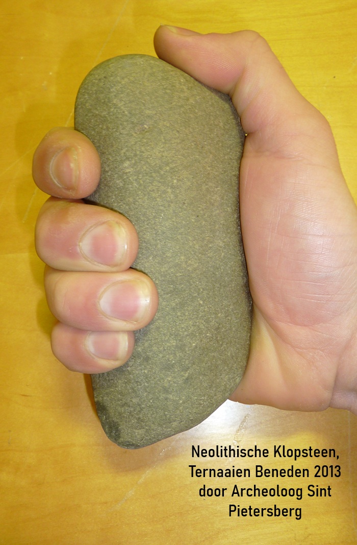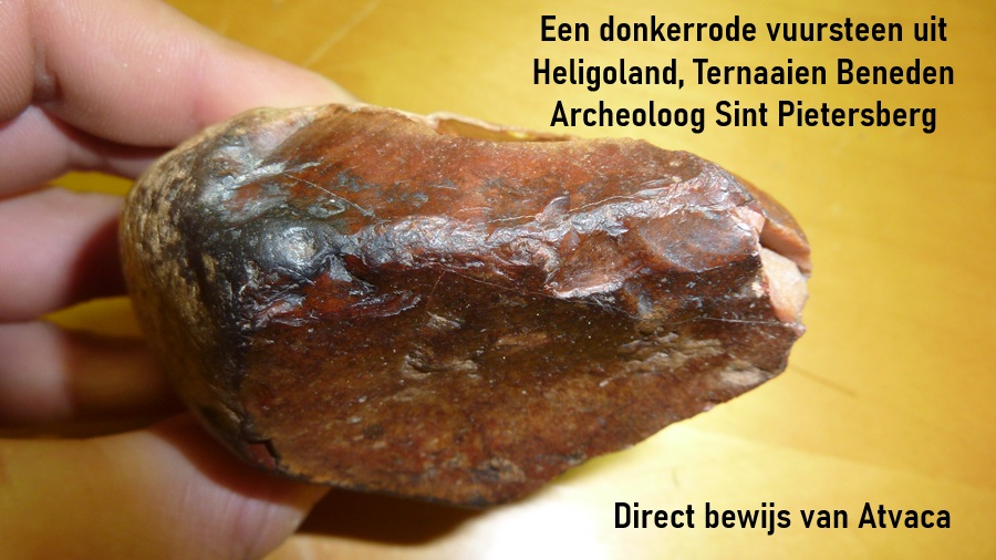 xvDe donkerrode Heligoland vuursteen waarmee een dateerbaar artefact op de plaats werd aangetoond. Precieze vindplaats blijft voorlopig geheim, maar algemeen kan gesteld worden dat het binnenin de groeve Ternaaien Beneden betreft. De steen werd aangetroffen in 2013 door de auteur van dit artikel, RVW.