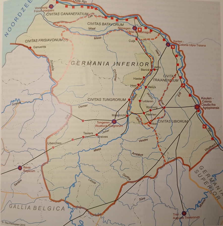 De Romeinse Provincie Germania Inferior, waar onze regio destijds deel van uitmaakte. Zoals we zien ligt de Sint Pietersberg “Ongeveer in het midden van het land der Eburonen”. Naar Titus Panhuysen 2013vi.