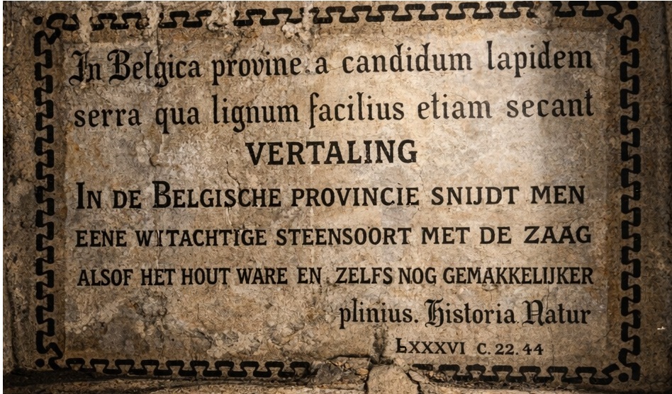 “Er zijn ook opmerkelijke voorbeelden, voorbij de Alpen, van de natuurlijke zachtheid van bepaalde soorten steen. In het gebied van de Belgae is er een witte steen die met dezelfde zaag als voor hout gezaagd kan worden, en zelfs nog gemakkelijker. Deze steen wordt gebruikt als vervanging voor dakpannen en gootpannen, en zelfs voor het soort dakbedekking dat bekendstaat als de ‘pavonaceus’-stijl, als men dat verkiest. Dit zijn de stenen die in dunne platen gezaagd kunnen worden.”
