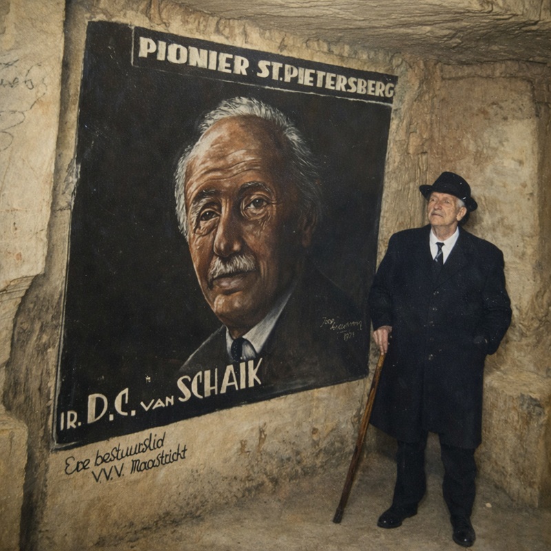 De electrotechnisch ingenieur DC van Schaïk staat bij een portret van hemzelf in het Noordelijk Gangenstelsel te Maastricht. Afbeelding ingekleurd met ChatGPT.