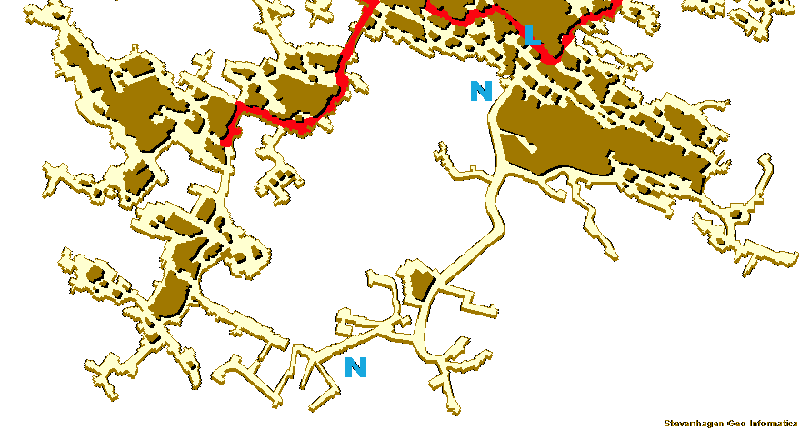 300 m). In de plattegrond ontbreekt ieder systeem, de maat van de gangen