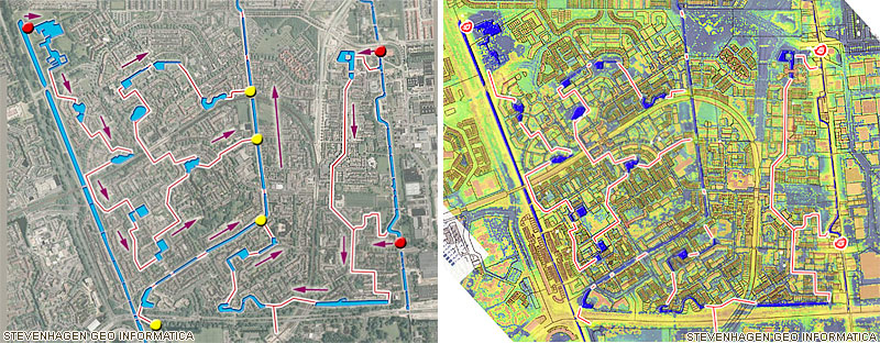Rechts in kleur de hoogteverschillen. Bruin-geel-groen hoog naar blauw op het laagste punt.