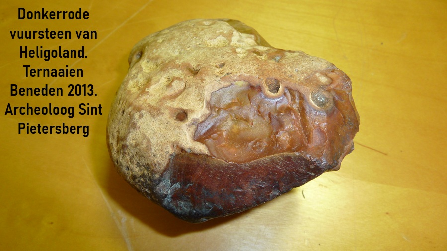 xvDe donkerrode Heligoland vuursteen waarmee een dateerbaar artefact op de plaats werd aangetoond. Precieze vindplaats blijft voorlopig geheim, maar algemeen kan gesteld worden dat het binnenin de groeve Ternaaien Beneden betreft. De steen werd aangetroffen in 2013 door de auteur van dit artikel, RVW.